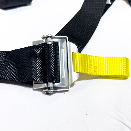 2" lap straps with aluminum adjusters in pull-up configuration and attachment via snap hook/tri-bar